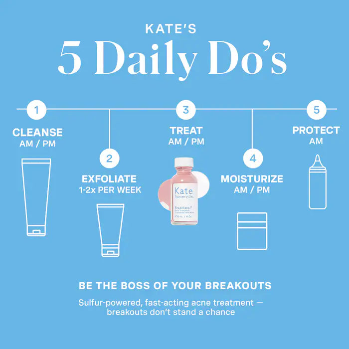Kate Somerville EradiKate Acne Spot Treatment with 10% Sulfur es un tratamiento localizado formulado para reducir visiblemente brotes de acné y granos activos. Con 10% de azufre, ayuda a secar imperfecciones, purificar los poros y disminuir el enrojecimiento sin comprometer el equilibrio de la piel.
