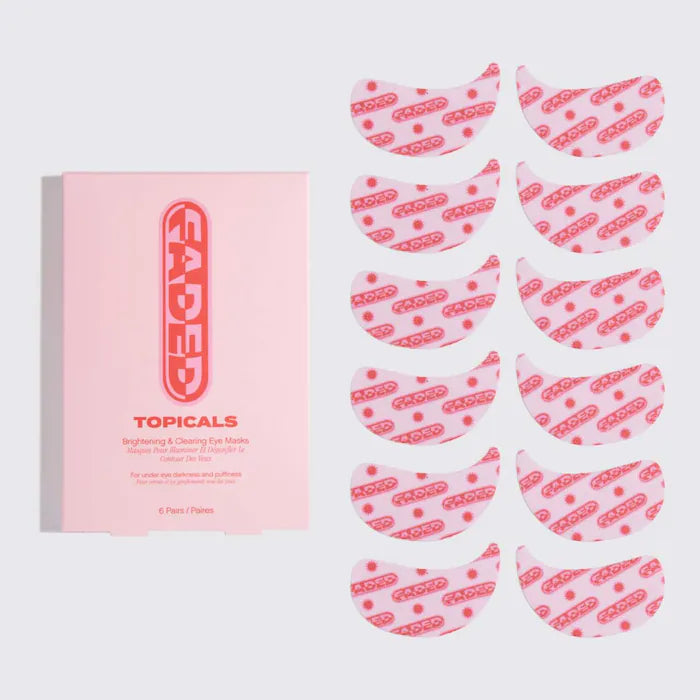 Topicals Faded Under Eye Brightening & Clearing Eye Masks son parches para el contorno de ojos diseñados para iluminar, unificar el tono y mejorar visiblemente la apariencia de ojeras, manchas y signos de fatiga. Inspirados en el tratamiento icónico Faded de la marca, estos eye masks combinan activos despigmentantes, calmantes e hidratantes que trabajan de forma eficaz pero suave en una de las zonas más delicadas del rostro.