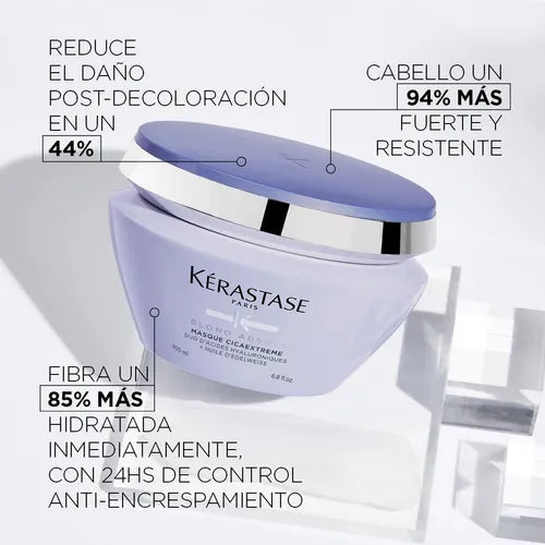Blond Absolu Masque Cicaextreme de Kérastase es una mascarilla capilar intensiva con ácido hialurónico, diseñada especialmente para el cabello rubio, decolorado o con mechas que necesita una recuperación profunda y fortalecimiento inmediato después del proceso químico.