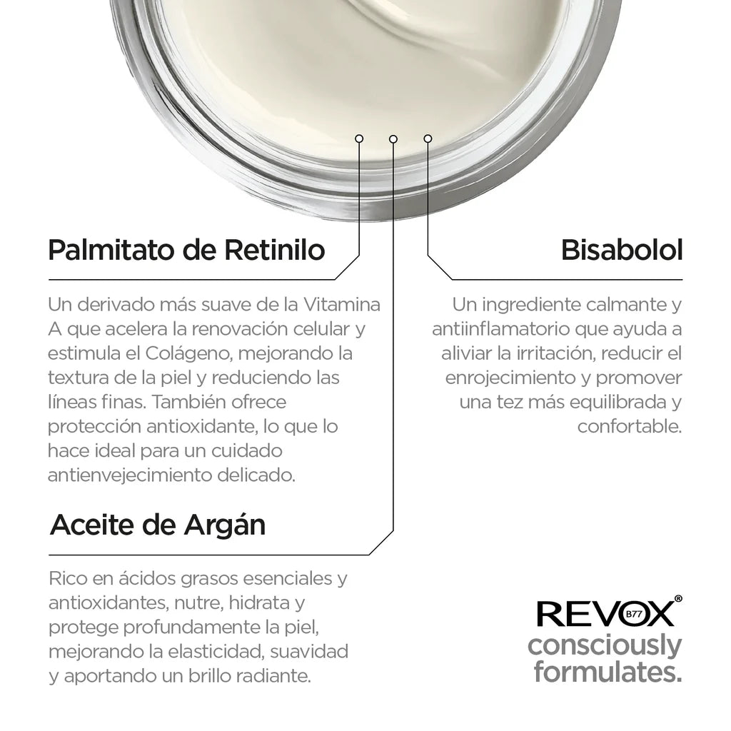 Revox B77 Retinol Cream es una crema facial antiedad formulada para mejorar la firmeza, suavidad y luminosidad de la piel. Su avanzada tecnología de retinol puro con liberación progresiva actúa de manera constante para estimular la producción de colágeno, mejorar la textura y reducir visiblemente líneas finas y arrugas. Enriquecida con Vitamina E y una mezcla nutritiva de aceites, esta crema aporta hidratación profunda mientras protege la piel del estrés oxidativo. Además, su SPF20 brinda protección diaria contra los rayos UV, ayudando a prevenir el fotoenvejecimiento. Ideal para usar de día y de noche, especialmente en pieles que buscan una rutina efectiva contra los signos de la edad.