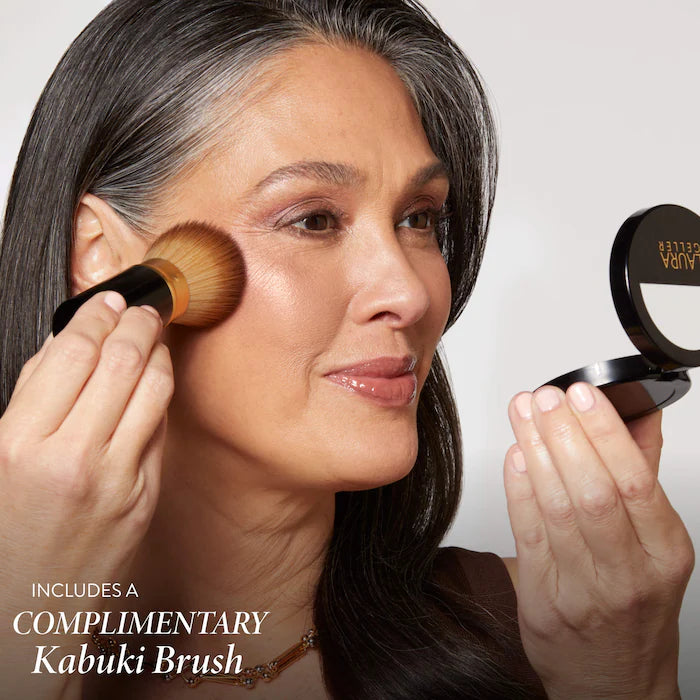La brocha kabuki incluida está diseñada para recoger la cantidad justa de producto y difuminarlo de manera uniforme, logrando un resultado suave, pulido y natural, incluso en pieles maduras o con textura.