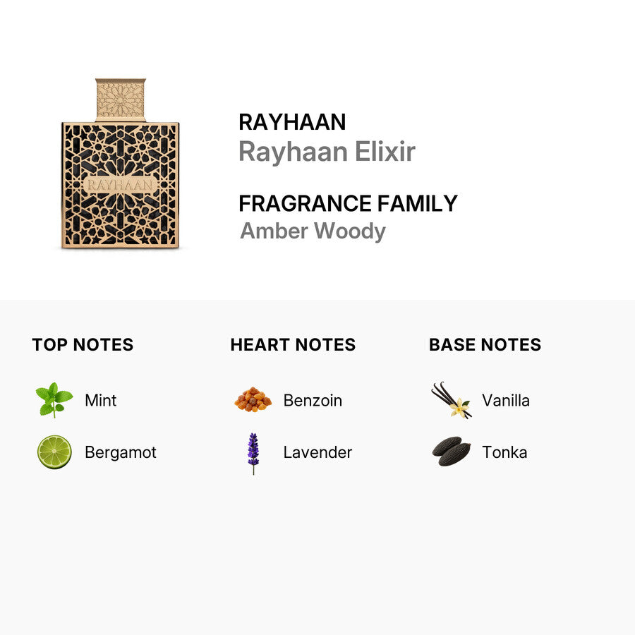 Rayhaan Elixir es una fragancia de la familia Ámbar Amaderada que combina frescura vibrante con una base cálida y envolvente, creando un aroma magnético y sofisticado. La apertura cautiva con la chispeante energía de la menta fresca y la luminosidad cítrica de la bergamota, ofreciendo una sensación revitalizante que despierta los sentidos.