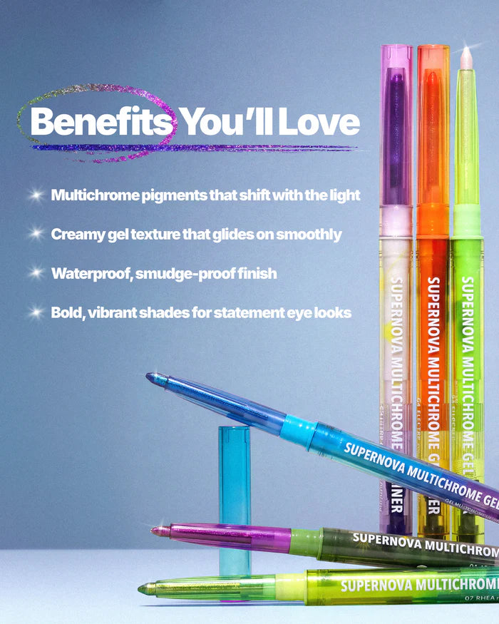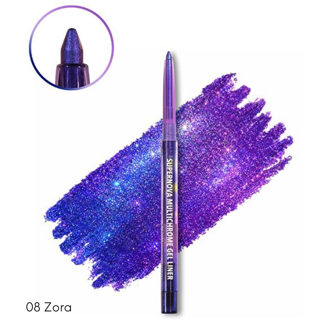 Moira Supernova Multichroma Gel Liner es un delineador en gel con efecto multichrome que cambia de tono según la luz, creando un acabado luminoso y multidimensional.