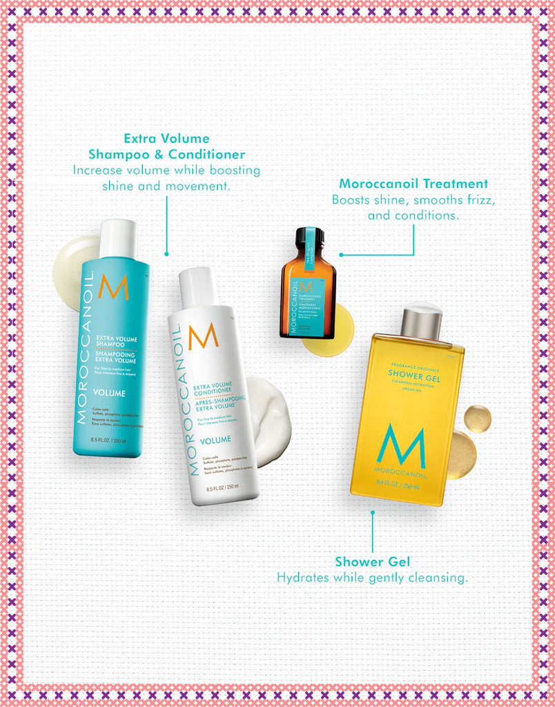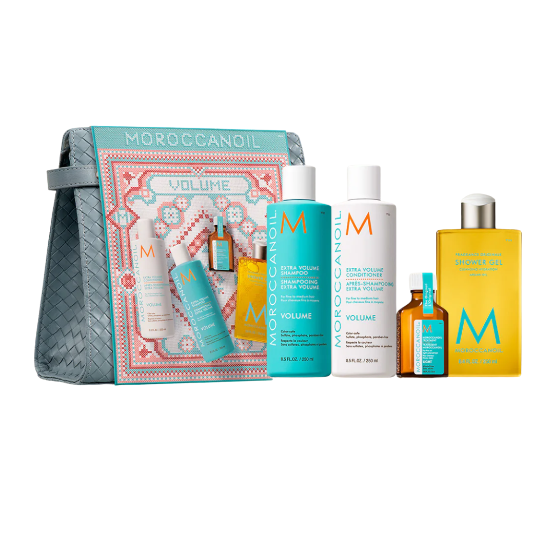 Contiene el Extra Volume Shampoo y Extra Volume Conditioner, que limpian suavemente mientras elevan la fibra capilar desde la raíz, el icónico Moroccanoil Treatment Light, que nutre, desenreda y aporta un brillo sedoso sin apelmazar, y el Shower Gel Fragrance Originale, que deja la piel hidratada y perfumada con el aroma inconfundible de Moroccanoil. Todo presentado en una sofisticada bolsa de regalo, perfecta para regalar o consentirse.