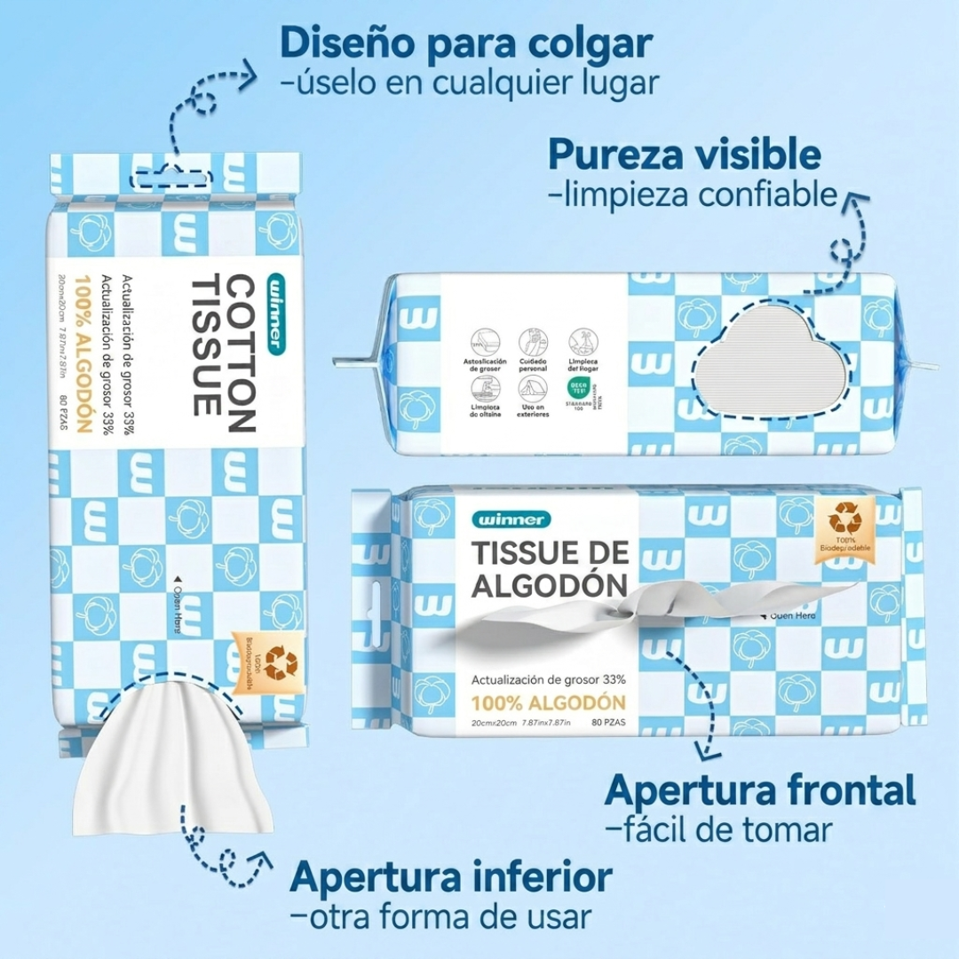¿Sigues usando toallas de tela que acumulan bacterias? Cambia tu rutina de cuidado personal con las Winner Cotton Tissue, la alternativa higiénica, suave y ecológica para el cuidado diario de tu rostro y cuerpo. Diseñadas con un 33% más de grosor, estas toallitas ofrecen una resistencia superior sin perder la delicadeza que tu piel necesita.